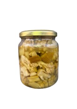 Un’esplosione di freschezza e colore, la giardiniera Trionfo in Verde è preparata con un’attenta selezione di verdure verdi come cavolo romano, sedano e peperoni verdi, lavorate artigianalmente per preservarne croccantezza e sapore naturale. Il delicato equilibrio in agrodolce esalta ogni ingrediente, rendendola ideale come antipasto, contorno o accompagnamento a formaggi e piatti di carne. Senza conservanti, realizzata con ingredienti genuini, per un’esperienza di gusto fresca e autentica.